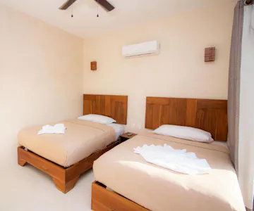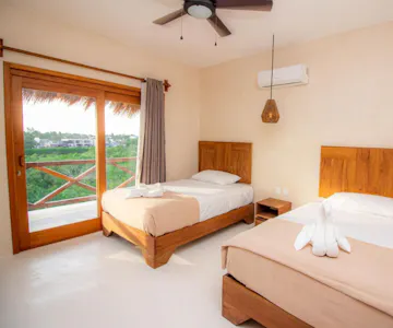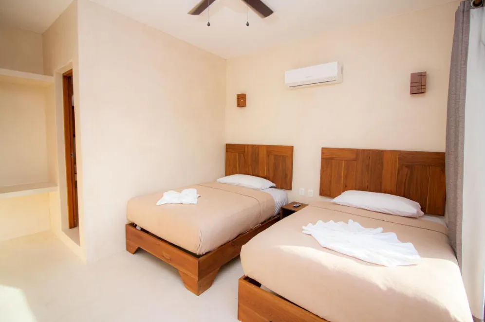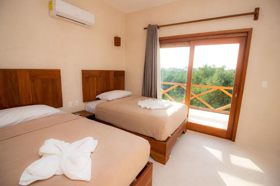 Esta habitación dispone de dos cómodas camas matrimoniales. Un amplio ventanal y un balcón que permiten disfrutar de abundante iluminación natural y de un ambiente acogedor, ideal para familias o grupos de hasta cuatro personas.